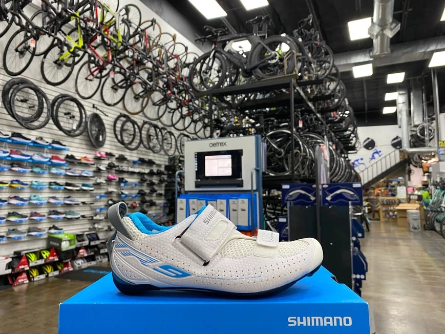 The Shimano Women’s SH-TR9W Shoe optimizes the functionality during race use, but truly shines in the Triathlon arena. The T1-Quick strap, extra wide collar, and asymmetrical heel loop slices away time during your transition period effortlessly. These shoes were designed with a women’s anatomic foot in mind for extra comfort. The 3D breathable mesh allows the maximum air flow to pass over your feet to optimize ventilation. The anatomic toe cap has air intakes to sustain the overall shape while allowing the ventilation system to work overtime. The ultra stiff carbon fiber composite sole transfers power ultra effectively as you pedal. Best paired with PD-9000 cleats. Weighs only 550 grams. Available in White.